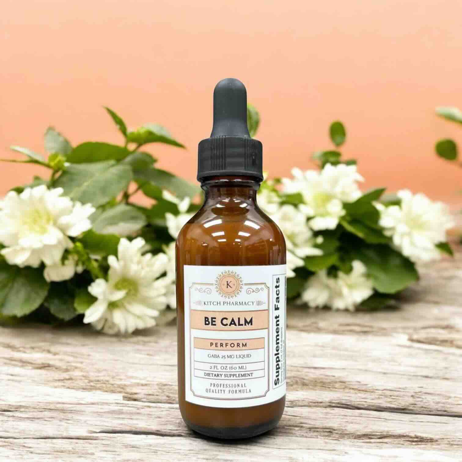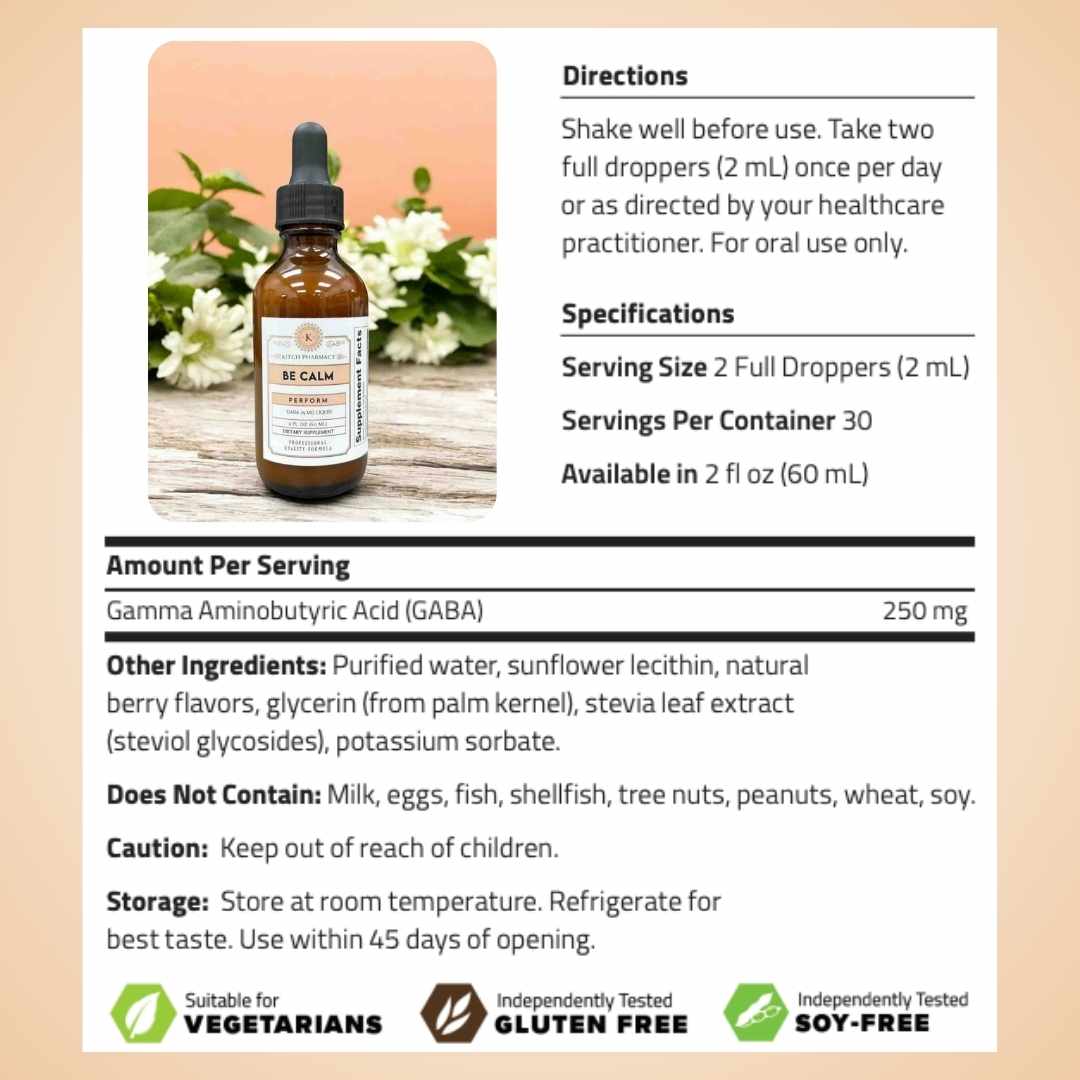 Each serving of Be Calm consists of 2 full droppers (2 mL), providing 250 mg of Gamma Aminobutyric Acid (GABA). Daily Value not established.