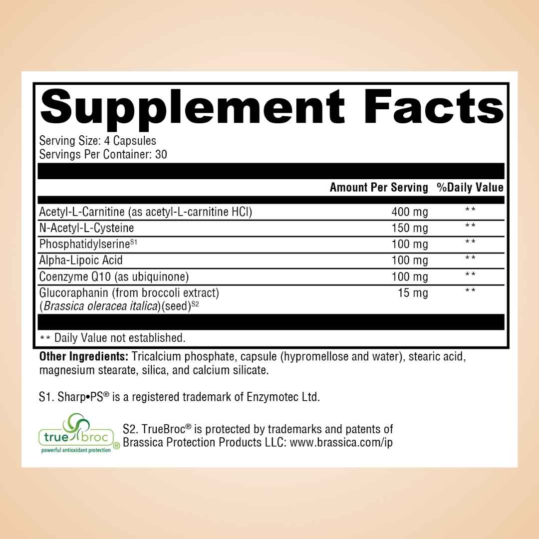 Each serving of Brain Fuel consists of four capsules. Each serving provides 400 mg of acetyl-L-carnitine (as acetyl-L-carnitine HCl), 150 mg of N-acetyl-L-cysteine, 100 mg of phosphatidylserine, 100 mg of alpha-lipoic acid, 100 mg of coenzyme Q10 (as ubiquinone), and 15 mg of glucoraphanin sourced from broccoli (Brassica oleracea italica) seed extract. Daily Value not established.