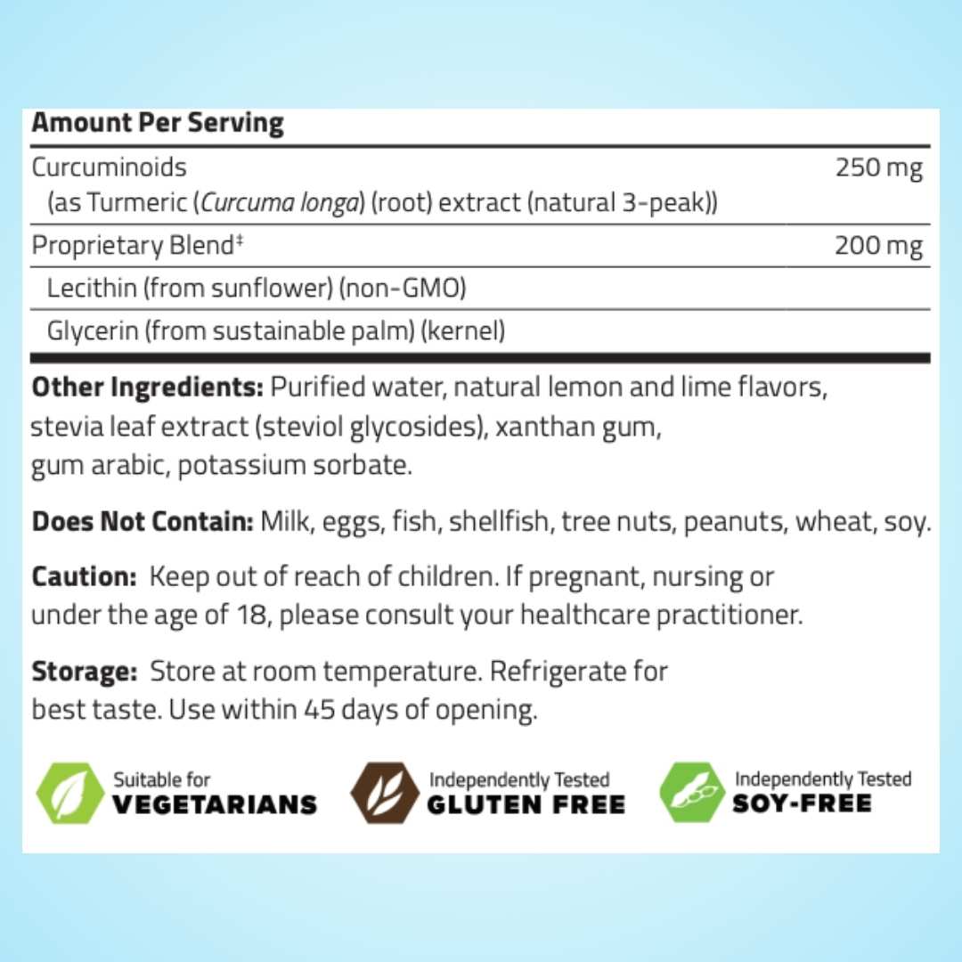 Each serving of Go For Gold Liquid consists of approximately 1 teaspoon (6 mL), with 30 or 60 servings per container. Each serving provides 250 mg of curcuminoids from turmeric (Curcuma longa root) extract (natural 3-peak) and 200 mg of a proprietary liposomal blend‡ made with non-GMO sunflower lecithin and glycerin derived from sustainable palm kernel. Daily Values for these ingredients have not been established.