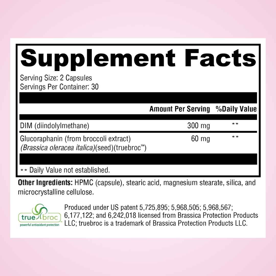 Each serving of Hormone Harmony consists of two capsules, with 30 or 60 servings per container. Each serving provides 300 mg of diindolylmethane (DIM) and 60 mg of glucoraphanin derived from broccoli (Brassica oleracea italica) seed extract (TrueBroc®). Daily Values for these ingredients have not been established.