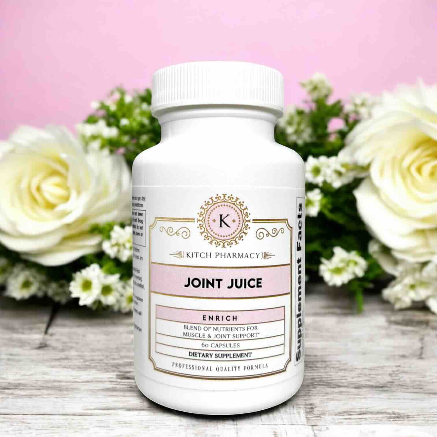 Joint Juice is a comprehensive formula designed to help maintain joint comfort, muscle resilience, and connective-tissue integrity. This premium blend combines botanicals and nutrients—including turmeric-derived curcumin, Boswellia serrata, ginger, and supportive amino acids—to promote overall mobility and structural balance.*