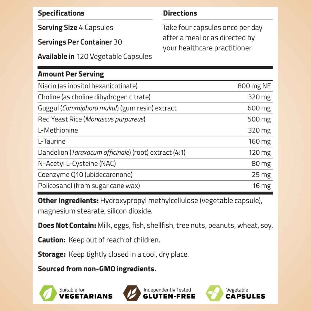 ✓ Choline, Methionine, Taurine, Dandelion Extract, N-Acetyl L-Cysteine (NAC), Inositol Hexanicotinate (Niacin), Guggul Extract, Policosanol*