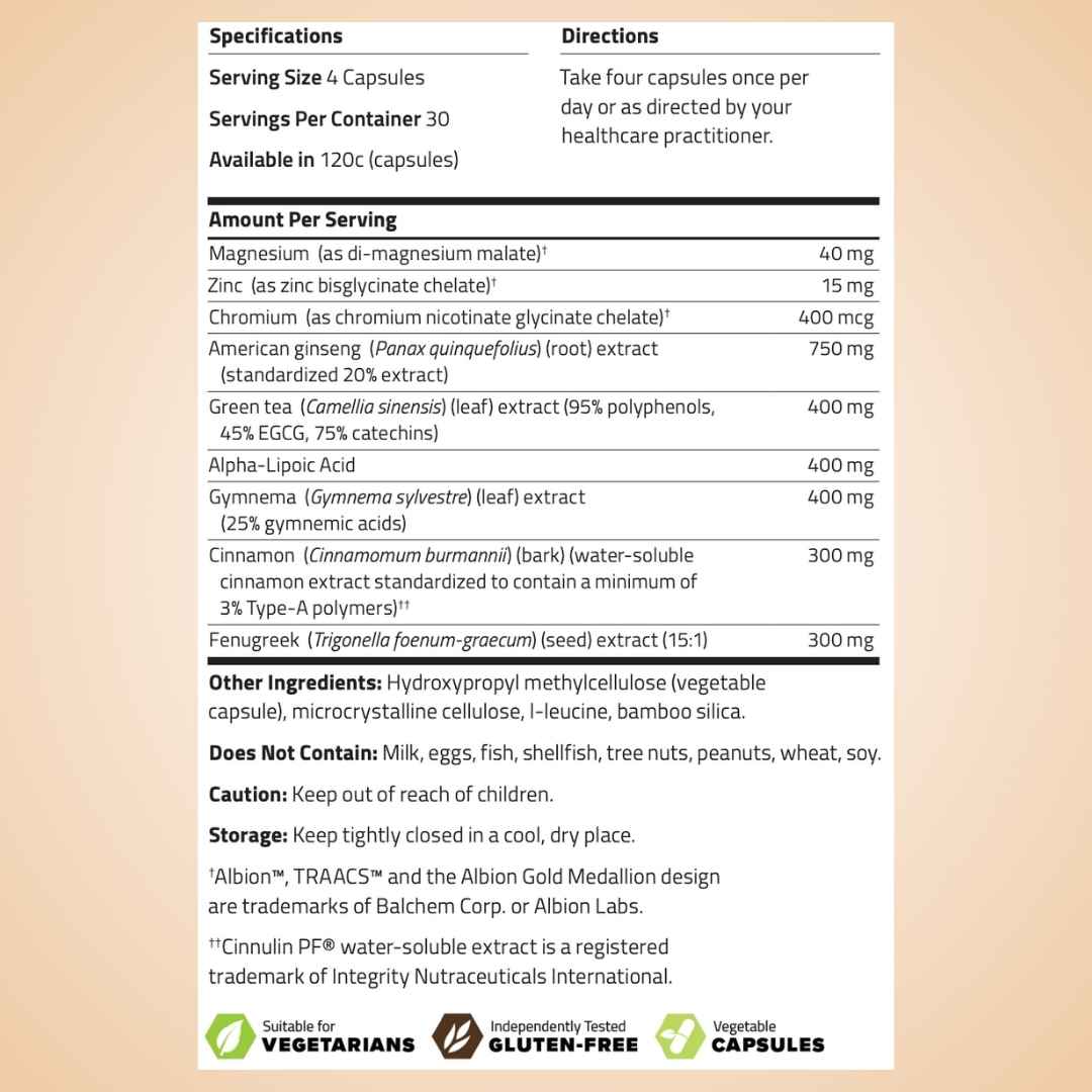 ✓ Cinnulin, American Ginseng, Gymnema Sylvestre, Green Tea Extract, Fenugreek Extract *
