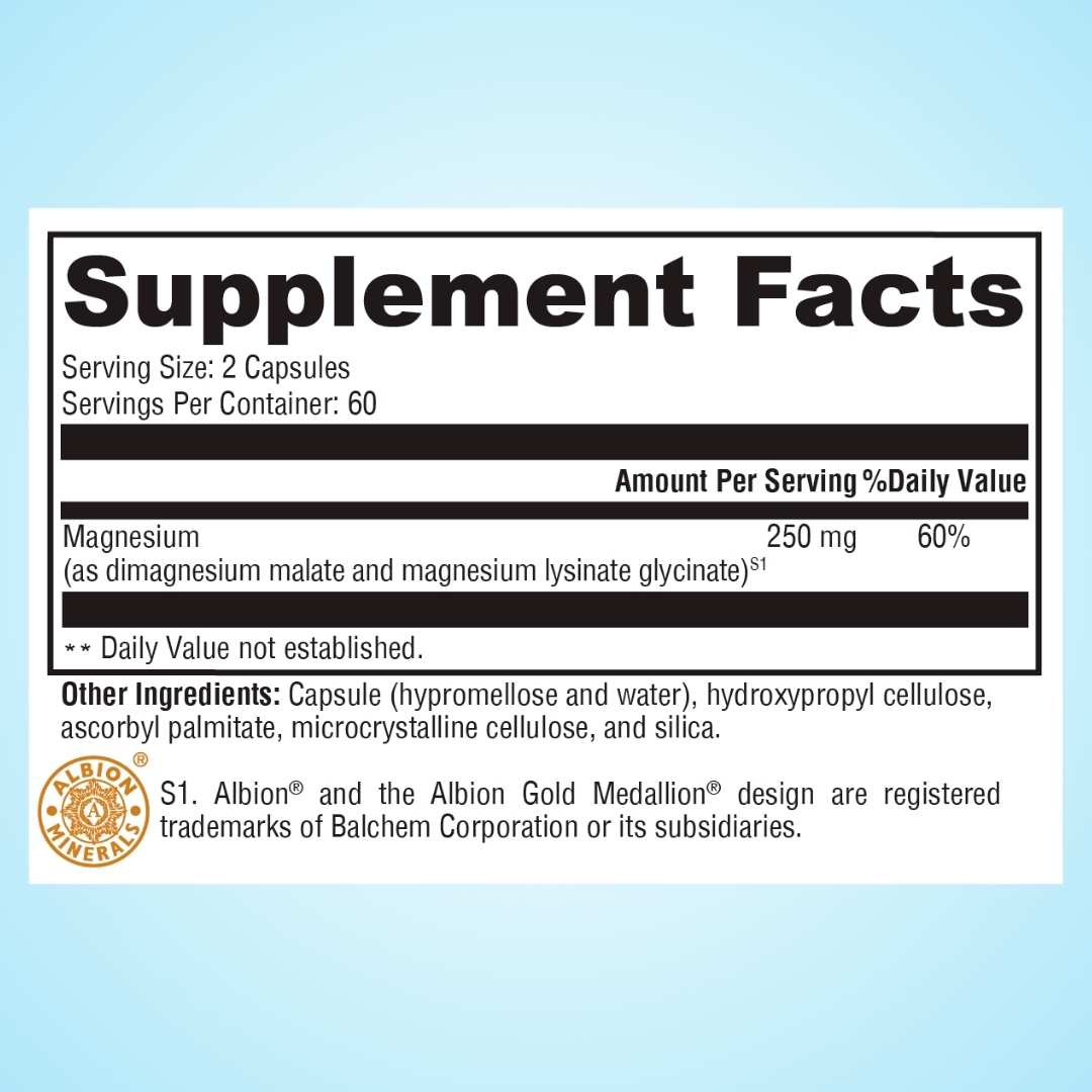 Each serving of Mighty Mag consists of two capsules, with 60 servings per container. Each serving provides 250 mg of magnesium (as dimagnesium malate and magnesium lysinate glycinate chelate), supplying 60% of the Daily Value. Daily Value has not been established for malate.