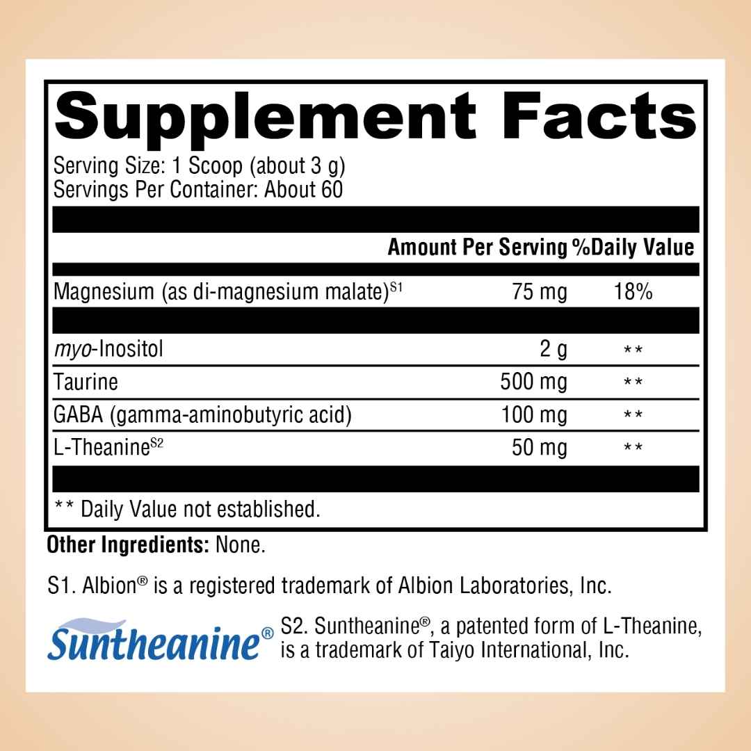 Each serving of Mind Unwind Powder consists of one scoop (3 g) and provides 75 mg of magnesium (as di-magnesium malate), 2 g of myo-inositol, 500 mg of taurine, 100 mg of gamma-aminobutyric acid (GABA), and 50 mg of L-theanine (as Suntheanine®). Daily Value not established.