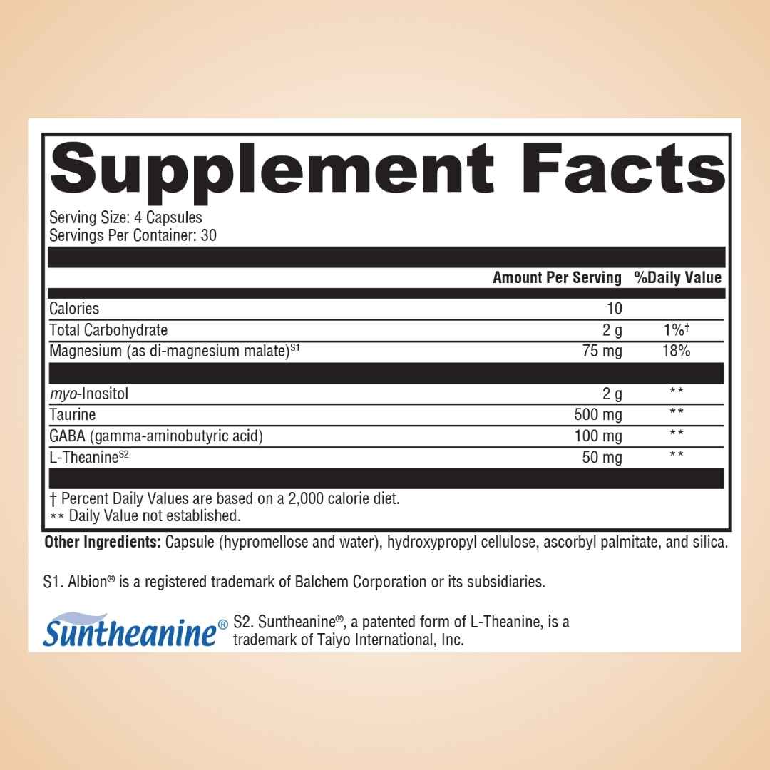 Each serving of Mind Unwind Capsules consists of four capsules, providing 10 calories, 2 g of total carbohydrates (1%†), 75 mg of magnesium (as di-magnesium malate), 2 g of myo-inositol, 500 mg of taurine, 100 mg of gamma-aminobutyric acid (GABA), and 50 mg of L-theanine (as Suntheanine®). Percent Daily Values are based on a 2,000-calorie diet. Daily Value not established.