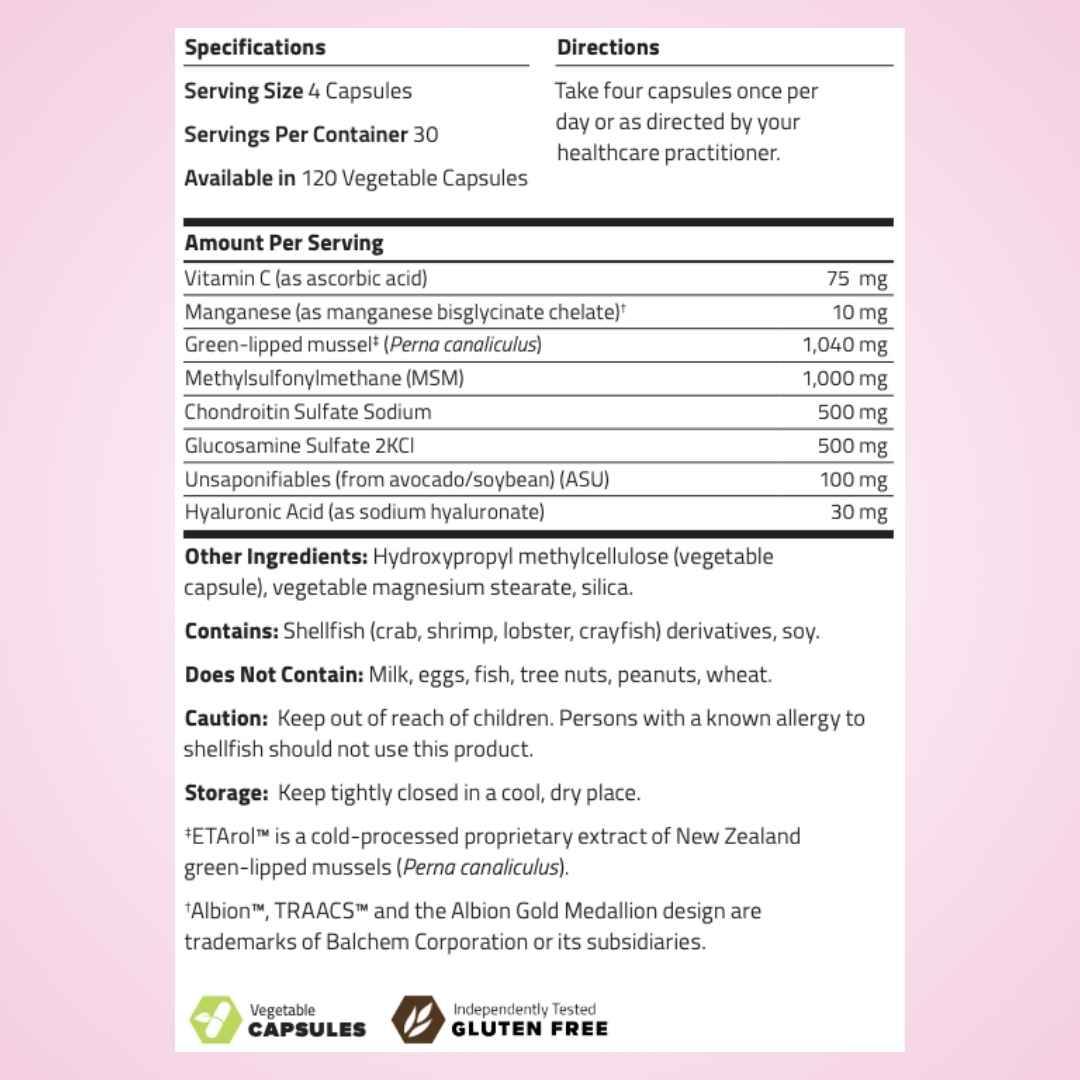 ✓ Contains ETArol™ green-lipped mussel extract, a premium source of naturally occurring glycosaminoglycans *