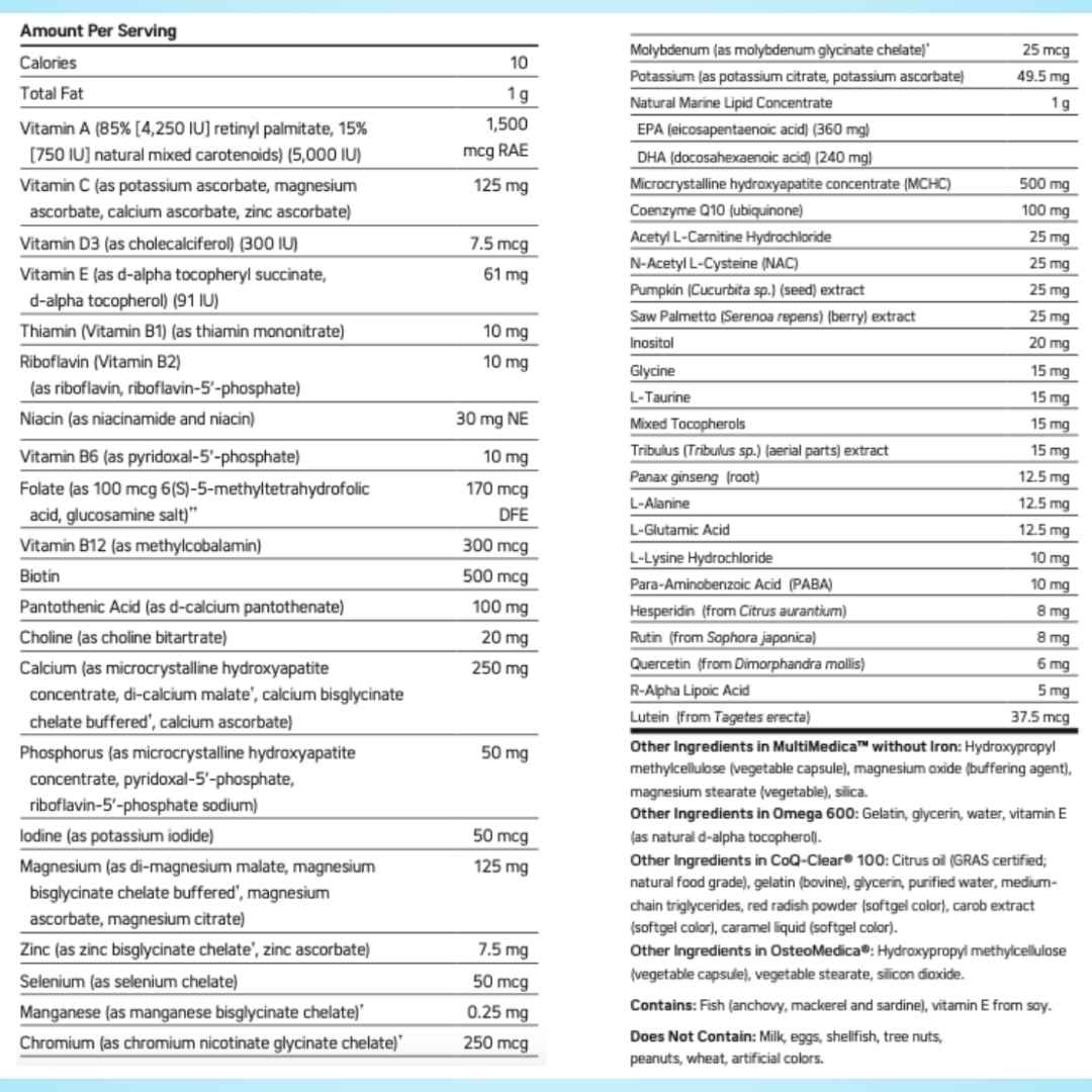 Other Ingredients: For MultiMedica™ Without Iron — hydroxypropyl methylcellulose (vegetable capsule), magnesium oxide (buffering agent), magnesium stearate (vegetable), and silica. For OsteoMedica® — hydroxypropyl methylcellulose (vegetable capsule), vegetable stearate, and silicon dioxide. For Omega 600™ — gelatin, glycerin, water, and vitamin E (as natural d-alpha tocopherol). For CoQ-Clear® 100 — citrus oil (GRAS certified; natural food grade), gelatin (bovine), glycerin, purified water, medium-chain triglycerides, red radish powder (softgel color), carob extract (softgel color), and caramel liquid (softgel color).