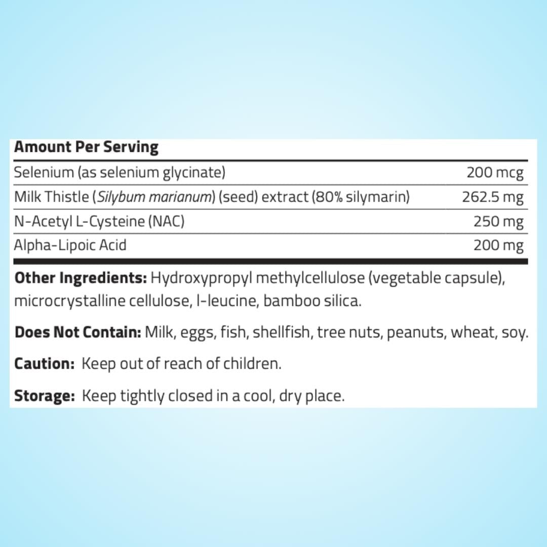 Each serving of Pure Liver consists of one capsule, with 60 servings per container. Each capsule provides 200 mcg of selenium (as selenium glycinate), supplying 364% of the Daily Value. It also includes 262.5 mg of milk thistle (Silybum marianum) seed extract standardized to 80% silymarin, 250 mg of N-acetyl L-cysteine (NAC), and 200 mg of alpha-lipoic acid. Daily Values for these ingredients, unless otherwise stated, have not been established.