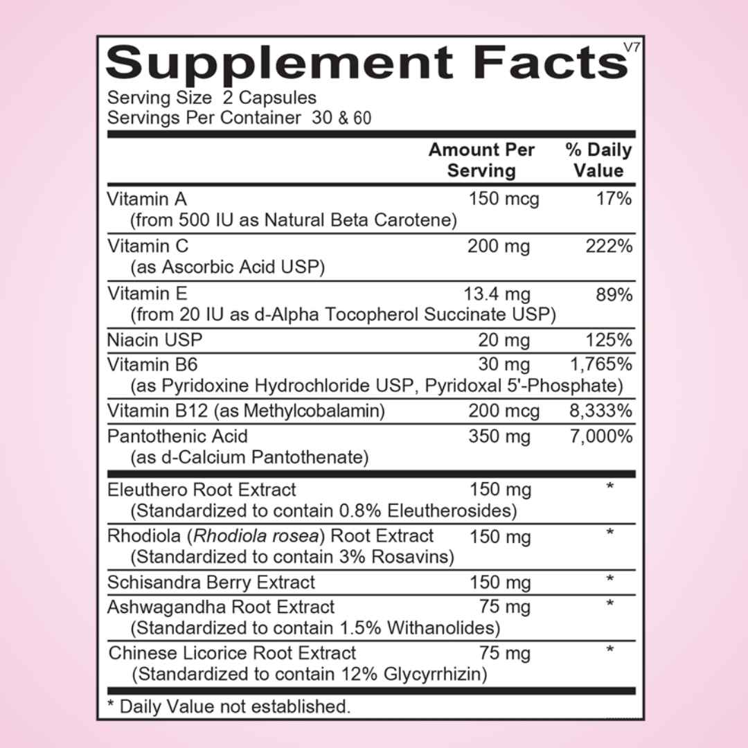 The formula also includes 150 mg of Eleuthero root extract standardized to 0.8% eleutherosides, 150 mg of Rhodiola rosea root extract standardized to 3% rosavins, 150 mg of Schisandra berry extract, 75 mg of Ashwagandha root extract standardized to 1.5% withanolides, and 75 mg of Licorice root extract (standardization to glycyrrhizin/glycyrrhetic acid not specified). Daily Values for some ingredients have not been established.
