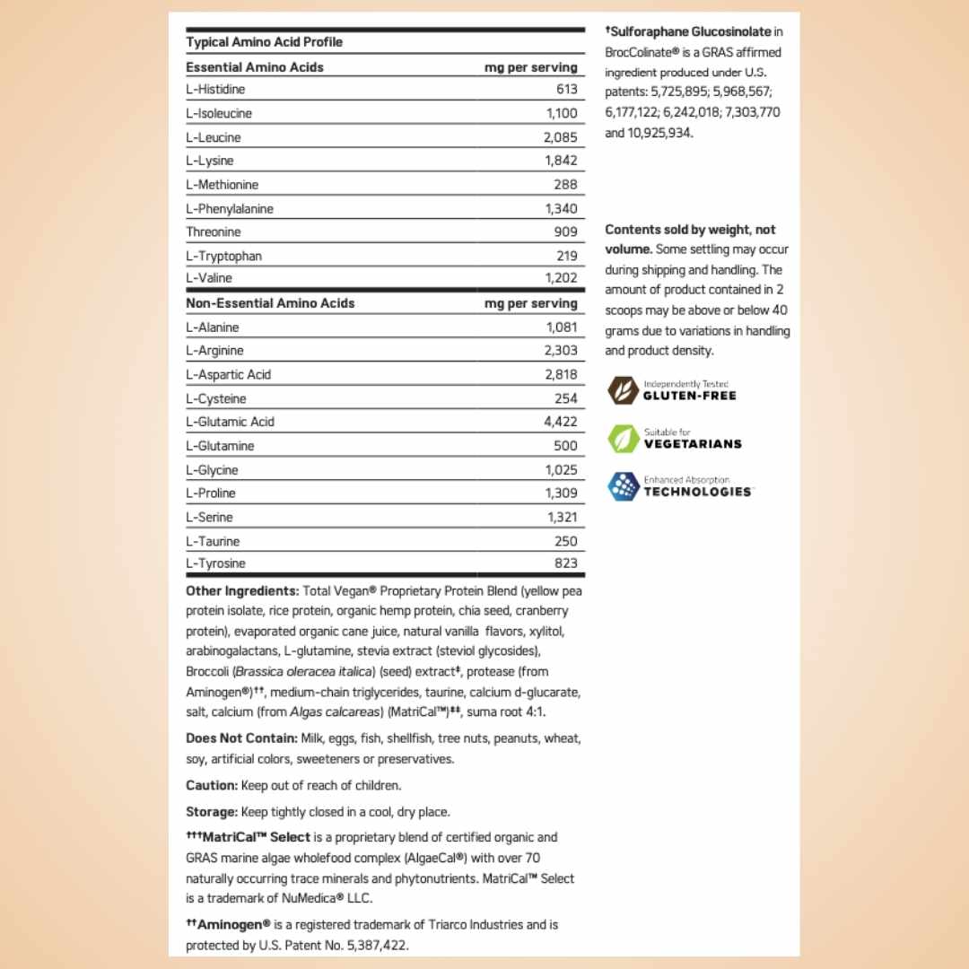 Other Ingredients: Total Vegan® Proprietary Protein Blend (yellow pea protein isolate, rice protein, organic hemp protein, chia seed, cranberry protein), evaporated organic cane juice, natural vanilla flavors, xylitol, arabinogalactans, L-glutamine, stevia extract (steviol glycosides), broccoli seed extract (Brassica oleracea italica)†, protease (from Aminogen®)†††, medium-chain triglycerides, taurine, calcium D-glucarate, salt, calcium (from Algas calcareas) (AlgaeCal® Select)††, and suma root 4:1.