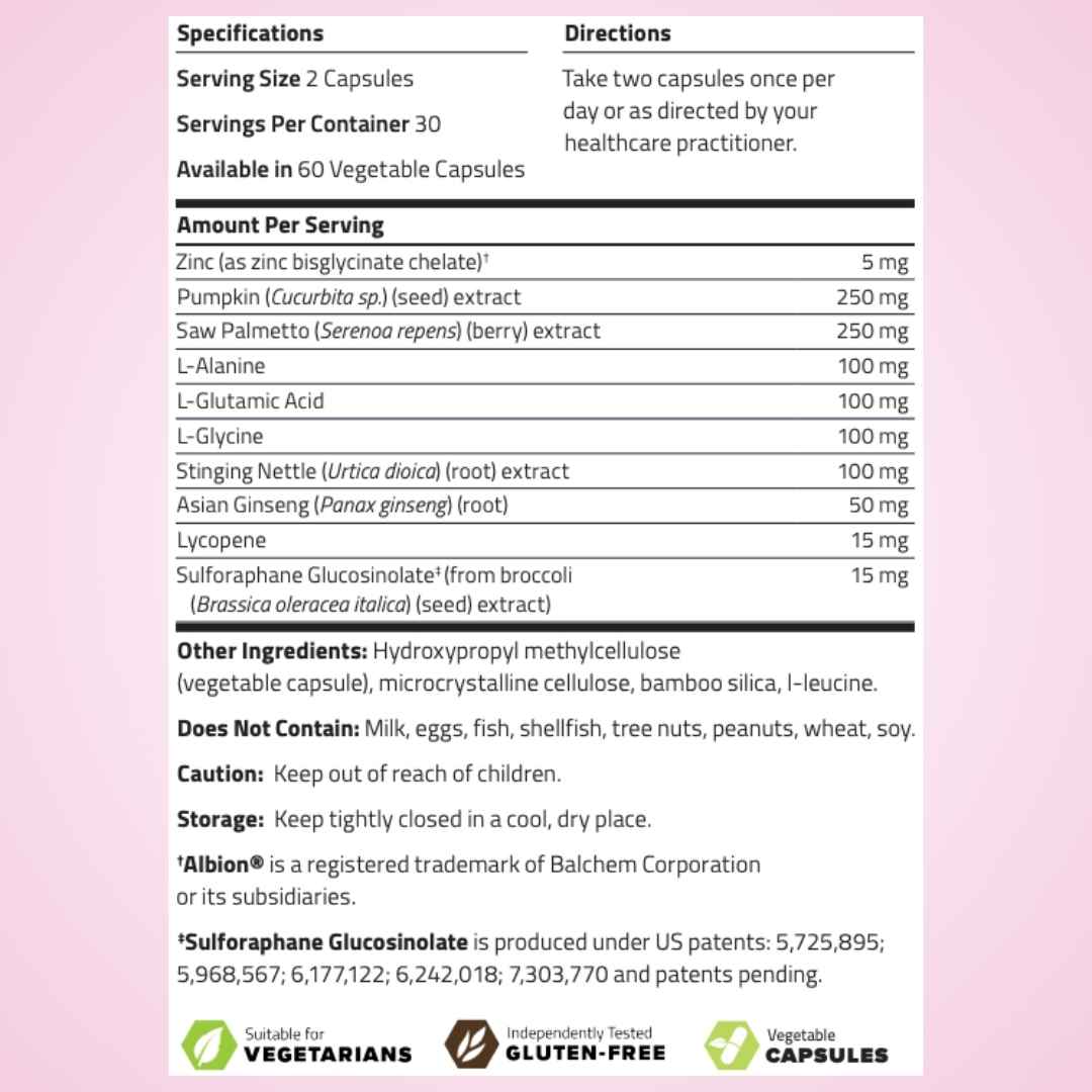Each serving of Wing Man consists of two capsules, with 30 servings per container. Each serving provides 5 mg of zinc (as zinc bisglycinate chelate††) along with a targeted blend of botanical extracts and amino acids to support men’s wellness. The formula includes 250 mg of saw palmetto (Serenoa repens, berry) extract, 250 mg of pumpkin (Cucurbita pepo, seed) extract (4:1), 150 mg of broccoli (Brassica oleracea L. italica, seed) extract (standardized to ≥ 10% sulforaphane glucosinolate†, 15 mg), 100 mg each of L-glycine, L-alanine, L-glutamic acid, and stinging nettle (Urtica dioica, root) extract (4:1). It also provides 50 mg of Asian ginseng (Panax ginseng, root) and 15 mg of lycopene. Daily Values for some ingredients have not been established.