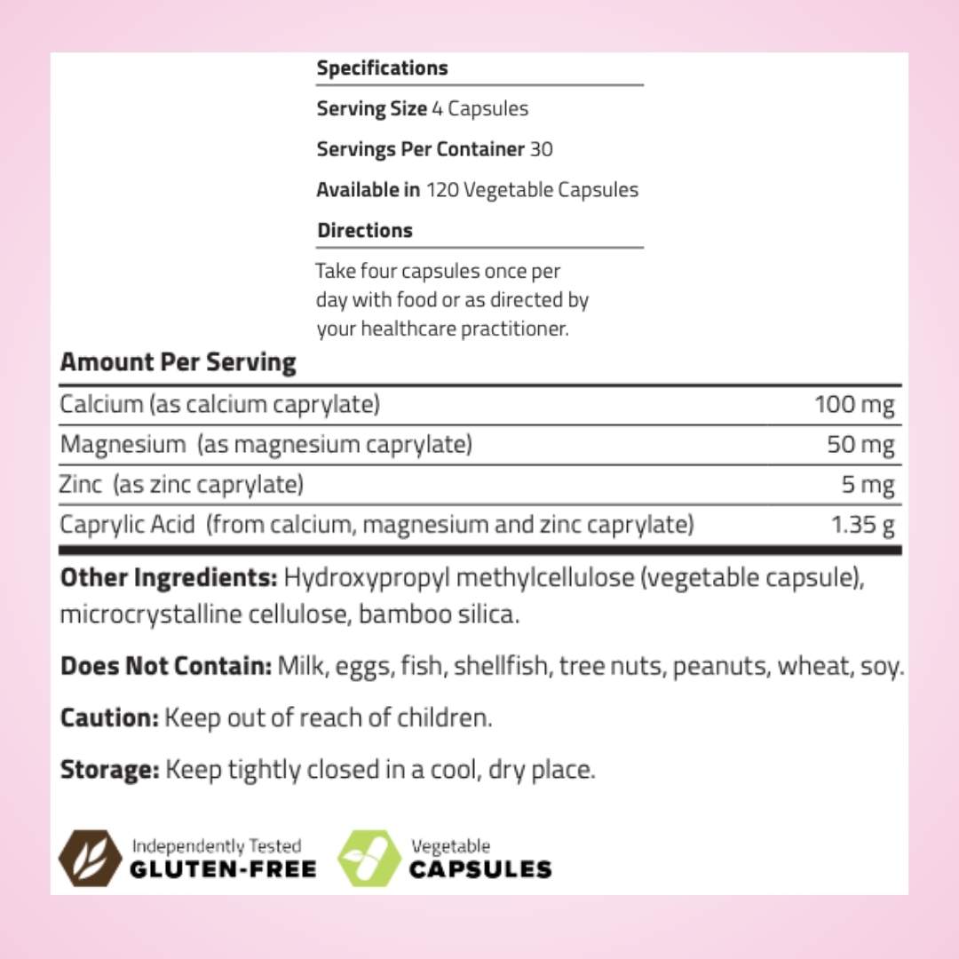 Each serving of Yeast Beast consists of four capsules, with 30 servings per container. Each serving provides 100 mg of calcium (as calcium caprylate), 50 mg of magnesium (as magnesium caprylate), 5 mg of zinc (as zinc caprylate), and 1.35 g of caprylic acid derived from calcium, magnesium, and zinc caprylates. Daily Values have not been established for these ingredients.